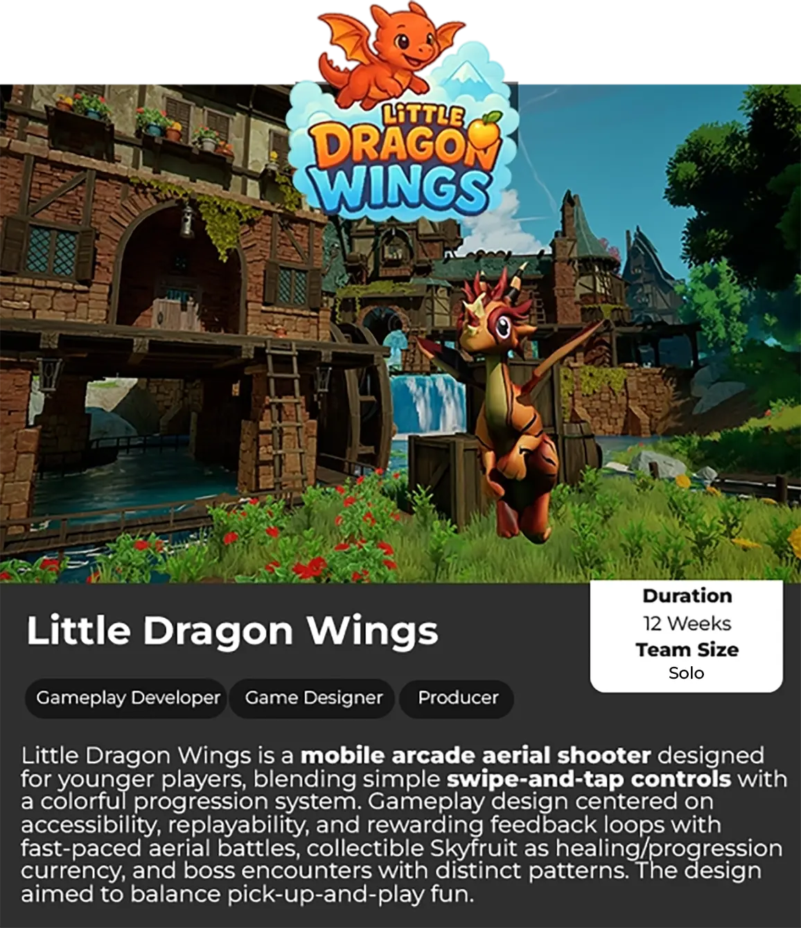 Little Dragon Wings is a mobile arcade aerial shooter designed for younger players, blending simple swipe-and-tap controls with a colorful progression system. Gameplay design centered on accessibility, replayability, and rewarding feedback loops with fast-paced aerial battles, collectible Skyfruit as healing/progression currency, and boss encounters with distinct patterns. The design aimed to balance pick-up-and-play fun.