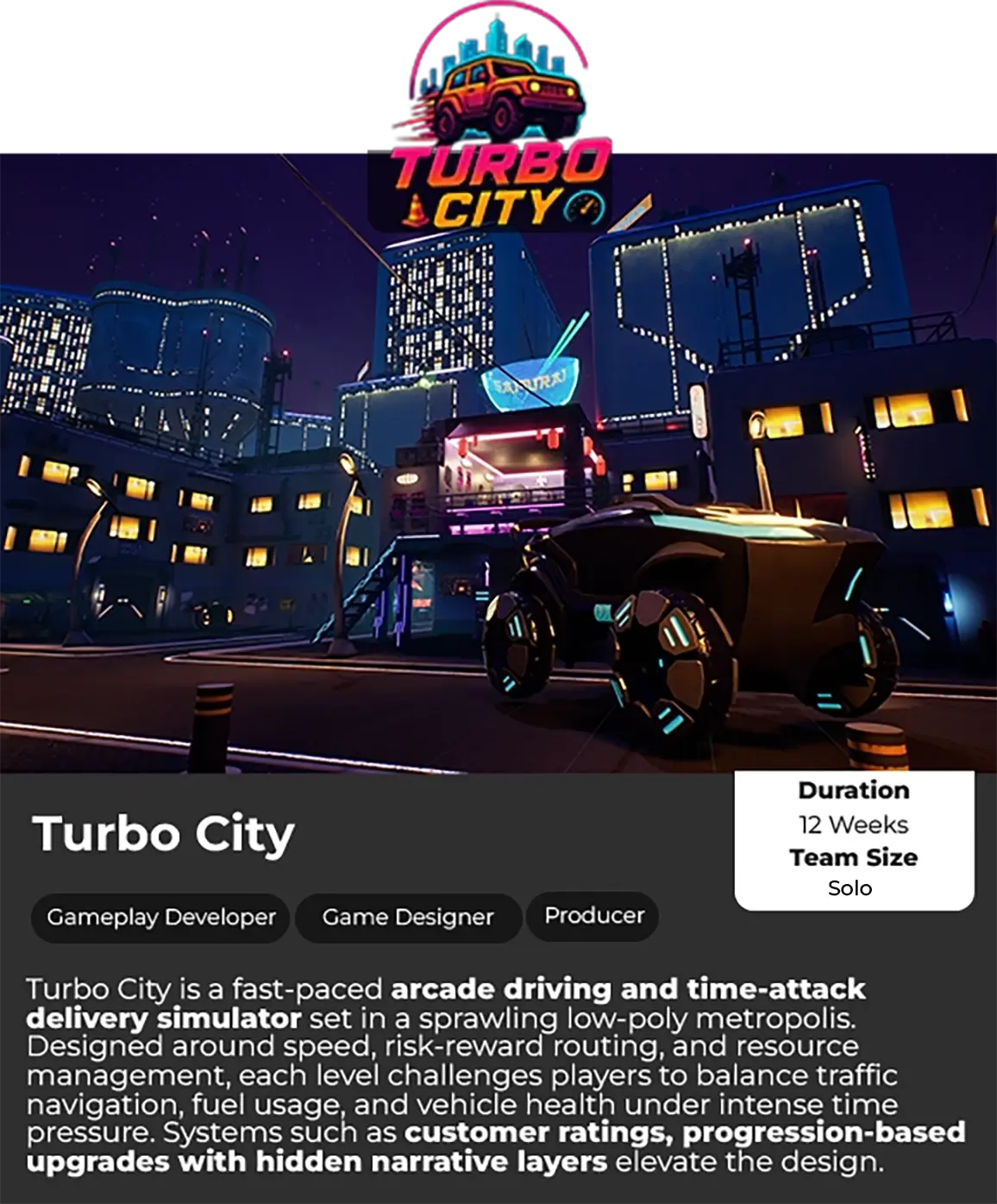 Turbo City is a fast-paced arcade driving and time-attack delivery simulator set in a sprawling low-poly metropolis. Designed around speed, risk-reward routing, and resource management, each level challenges players to balance traffic navigation, fuel usage, and vehicle health under intense time pressure. Systems such as customer ratings, progression-based upgrades with hidden narrative layers elevate the design.