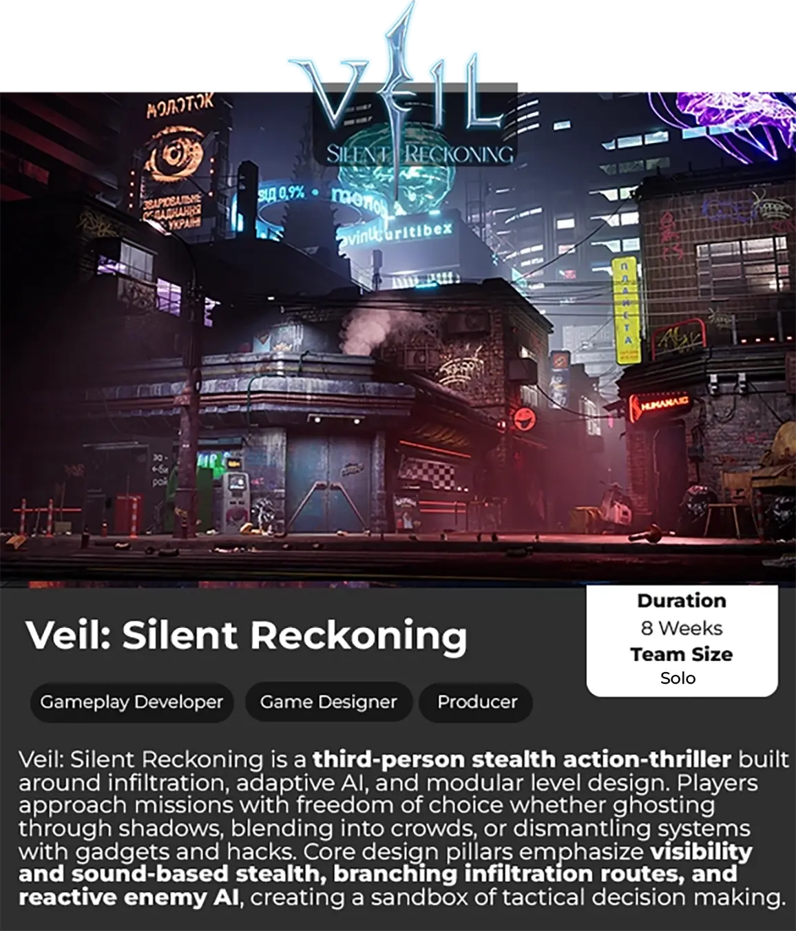Veil: Silent Reckoning is a third-person stealth action-thriller built around infiltration, adaptive AI, and modular level design. Players approach missions with freedom of choice whether ghosting through shadows, blending into crowds, or dismantling systems with gadgets and hacks. Core design pillars emphasize visibility and sound-based stealth, branching infiltration routes, and reactive enemy AI, creating a sandbox of tactical decision making. To reinforce immersion, each mission integrates cinematic set-pieces and narrative choices that ripple across the story.