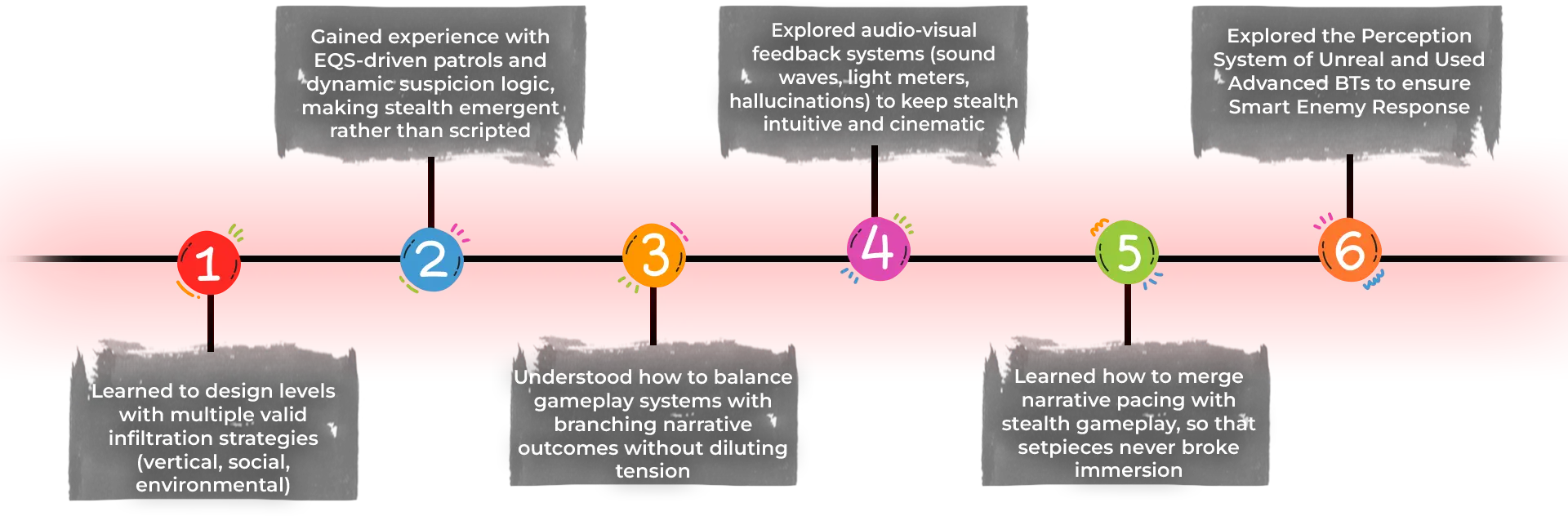 • Created light/shadow stealth meter, sound radius visualization and adaptive AI suspicion mechanics.